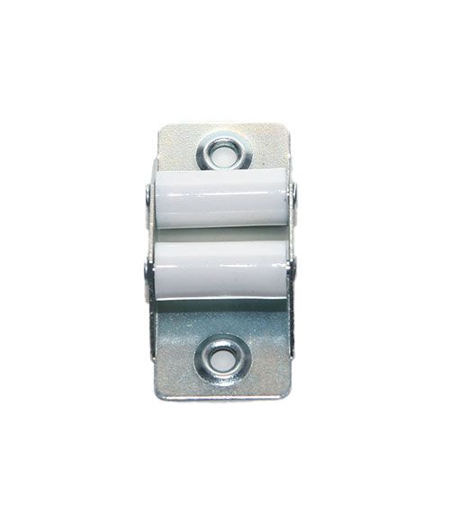 Pieza para guiar cintas de persiana en metal con dos rodillos de PVC. Cinta de 22